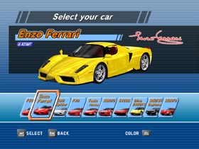 | 視点が後ろからなので、車種の区別が付きにくいのが難点ですが、 | スタート時やゴール時など、まれに違う角度から拝めます。ちなみにオンライン対戦も可。 |